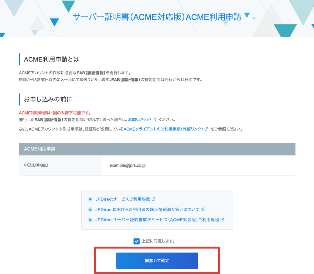 マイページからACME利用申請画面へアクセスし、サービス約款等をご確認の上、「同意して確定」をクリックしてください。 申請番号の確認ができます。