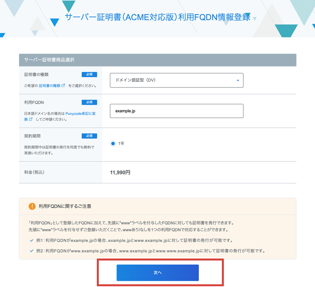 マイページから「利用FQDN情報登録画面」へアクセスし、証明書の種類を選択、利用FQDNを入力し、契約期間及び料金をご確認の上、「次へ」ボタンをクリックしてください。