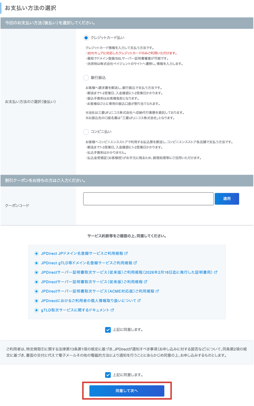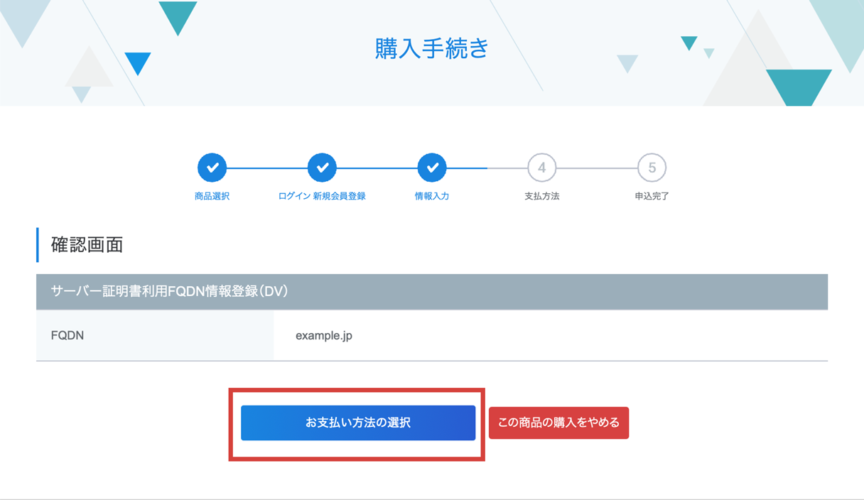 再度表示される利用FQDNをご確認の上、「お支払方法の選択」ボタンをクリックしてください。